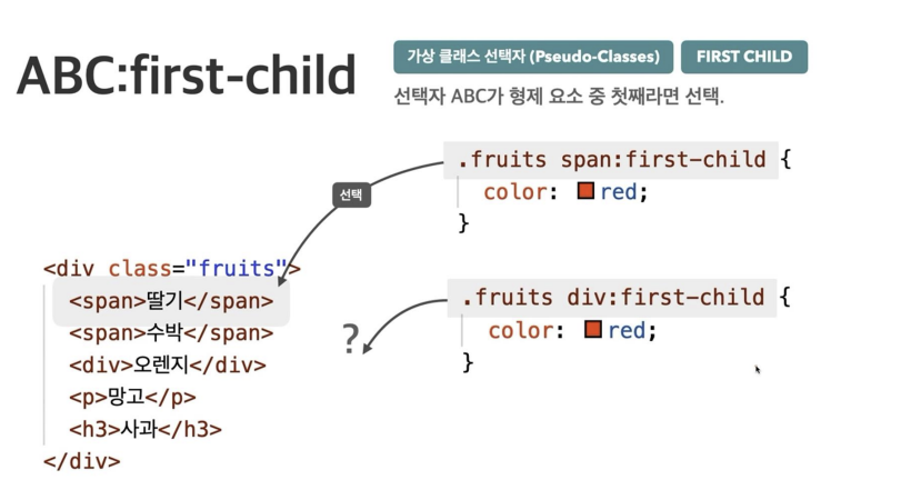 예를 들어 위의 내용은 "fruits이라는 클래스의 첫번째 자식 요소가 span이면 선택"이라는 뜻이다.