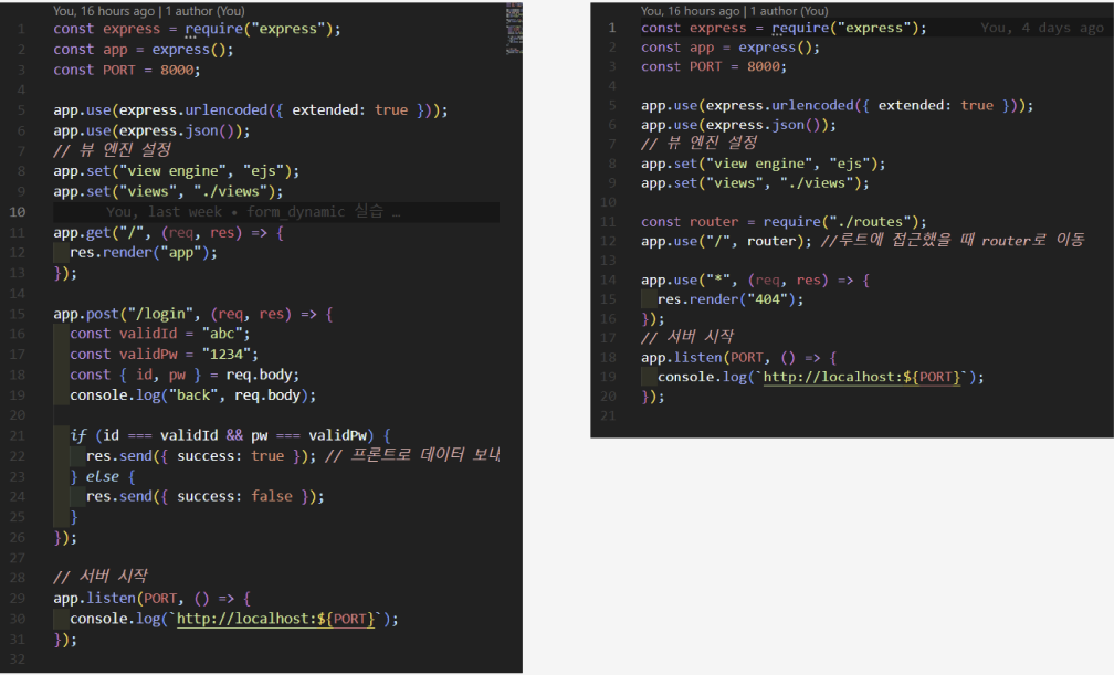 express, 포트번호, 미들웨어와 같은 기본적인 설정들을 한 후 라우터를 지정해준다.