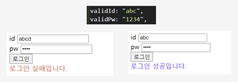 실습 내용: 가상의 DB에 임의의 아이디와 비밀번호가 있다. 사용자가 입력한 데이터와 일치한다면 로그인 성공 메시지를, 실패한다면 실패 메시지를 띄울 것이다.