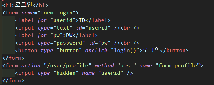 로그인 폼 아래 숨겨진 폼을 넣어서 로그인 버튼을 클릭하면 위에 폼과 아래 폼의 userid를 같게 한 후 /user/profile 에 보내준다.